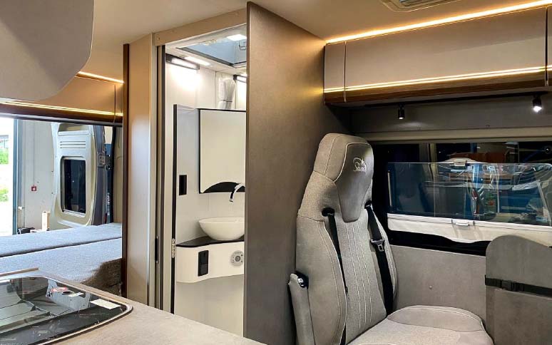 Ruimtedouche met draaibare wand (roomdivider) Dankzij het innovatieve draaiwandsysteem geniet u van een verrassend ruime douche, omkleedruimte én toilet. Deze slimme oplossing fungeert bovendien vaak als afscheiding tussen het slaapgedeelte en de leefruimte, waardoor u meer privacy én comfort ervaart.