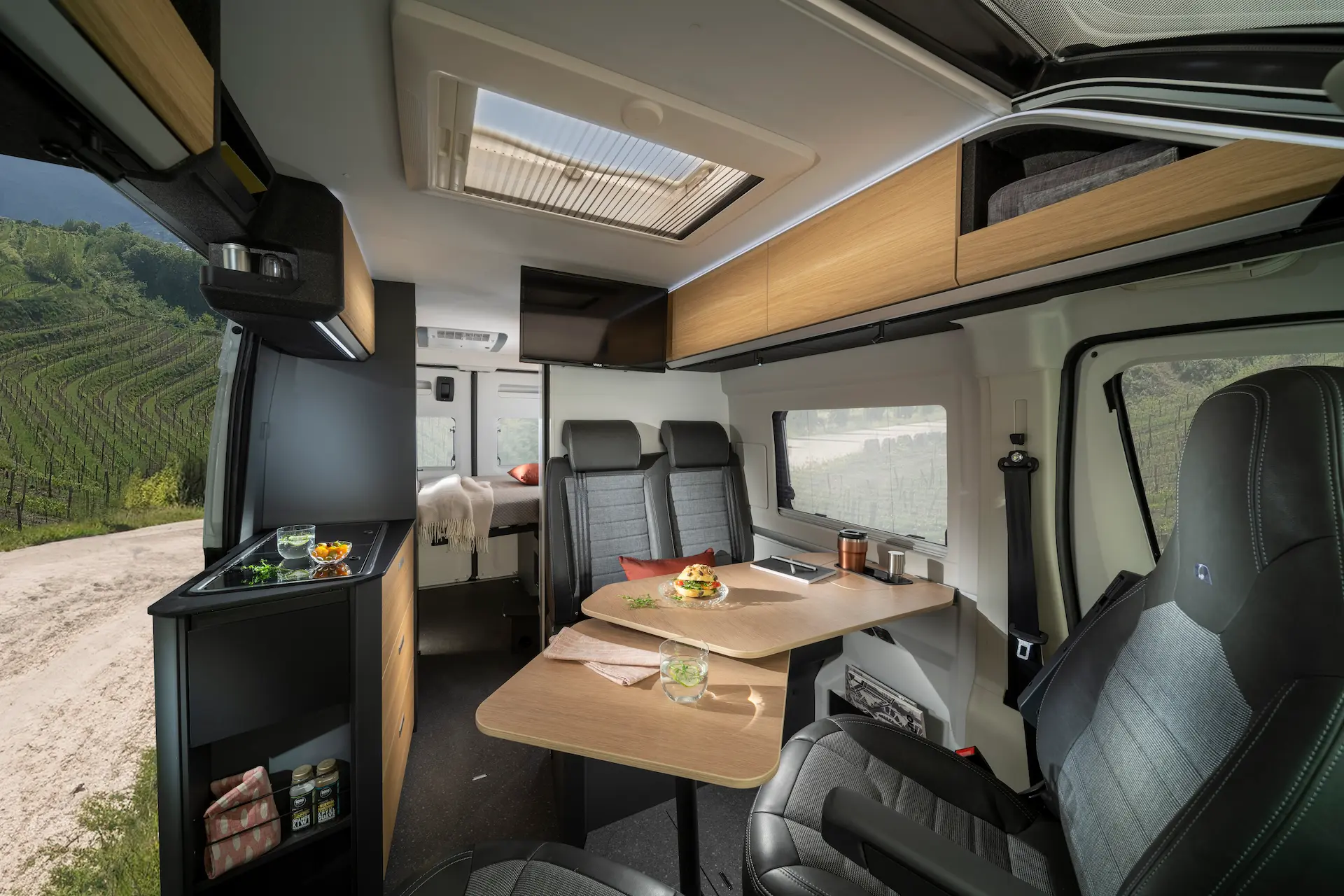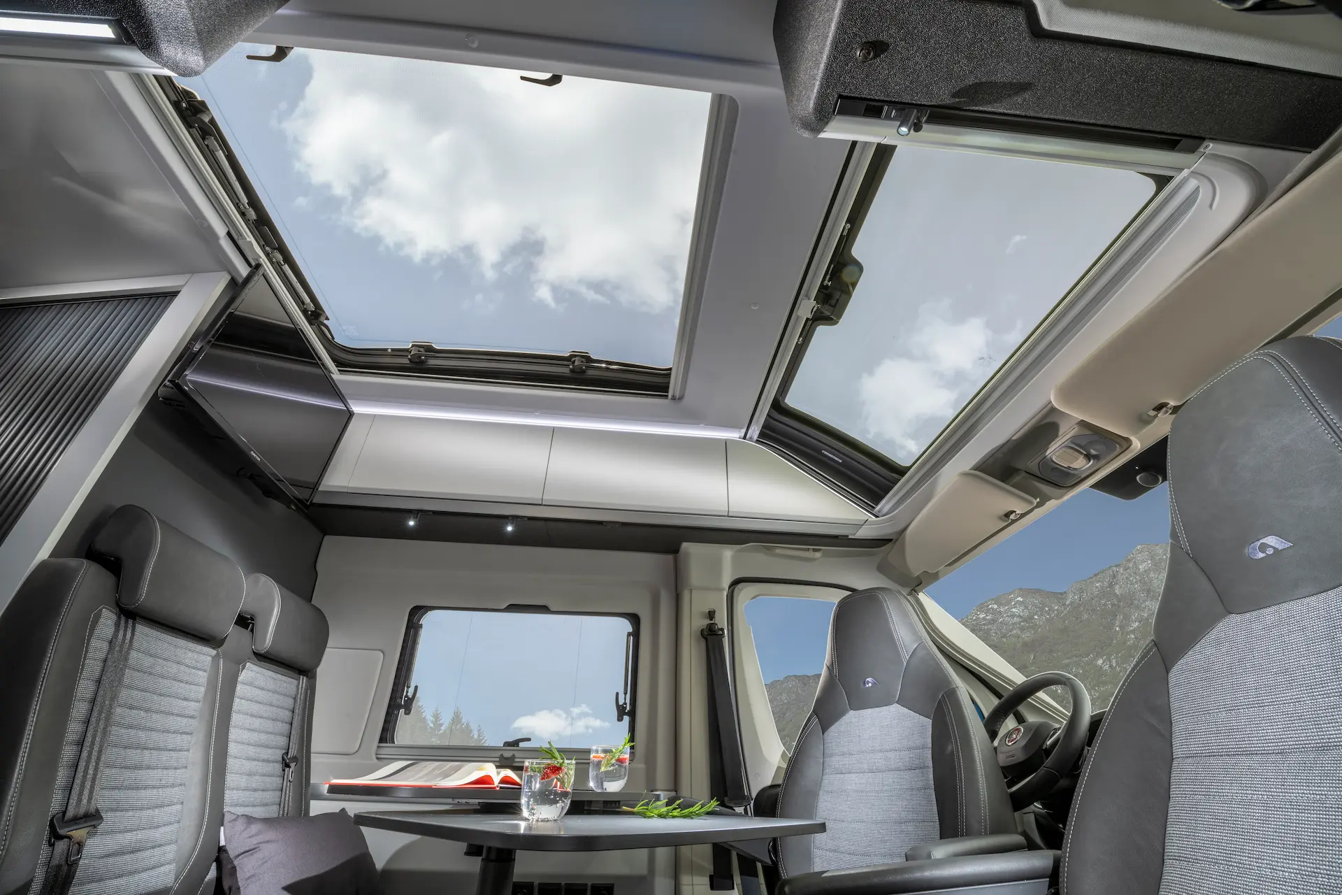 Ook de zitgroep biedt verschillende indelingsmogelijkheden. Gaat u voor praktische opbergruimte boven de cabine, of kiest u liever voor een open en licht interieur? Een open cabine of een Skyroof (panoramavenster boven de voorstoelen) zorgt voor extra lichtinval en een ruimtelijk gevoel.