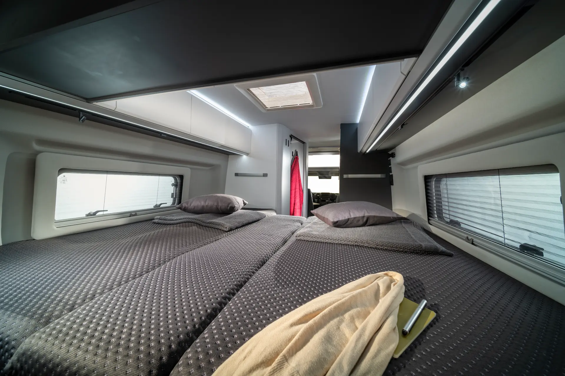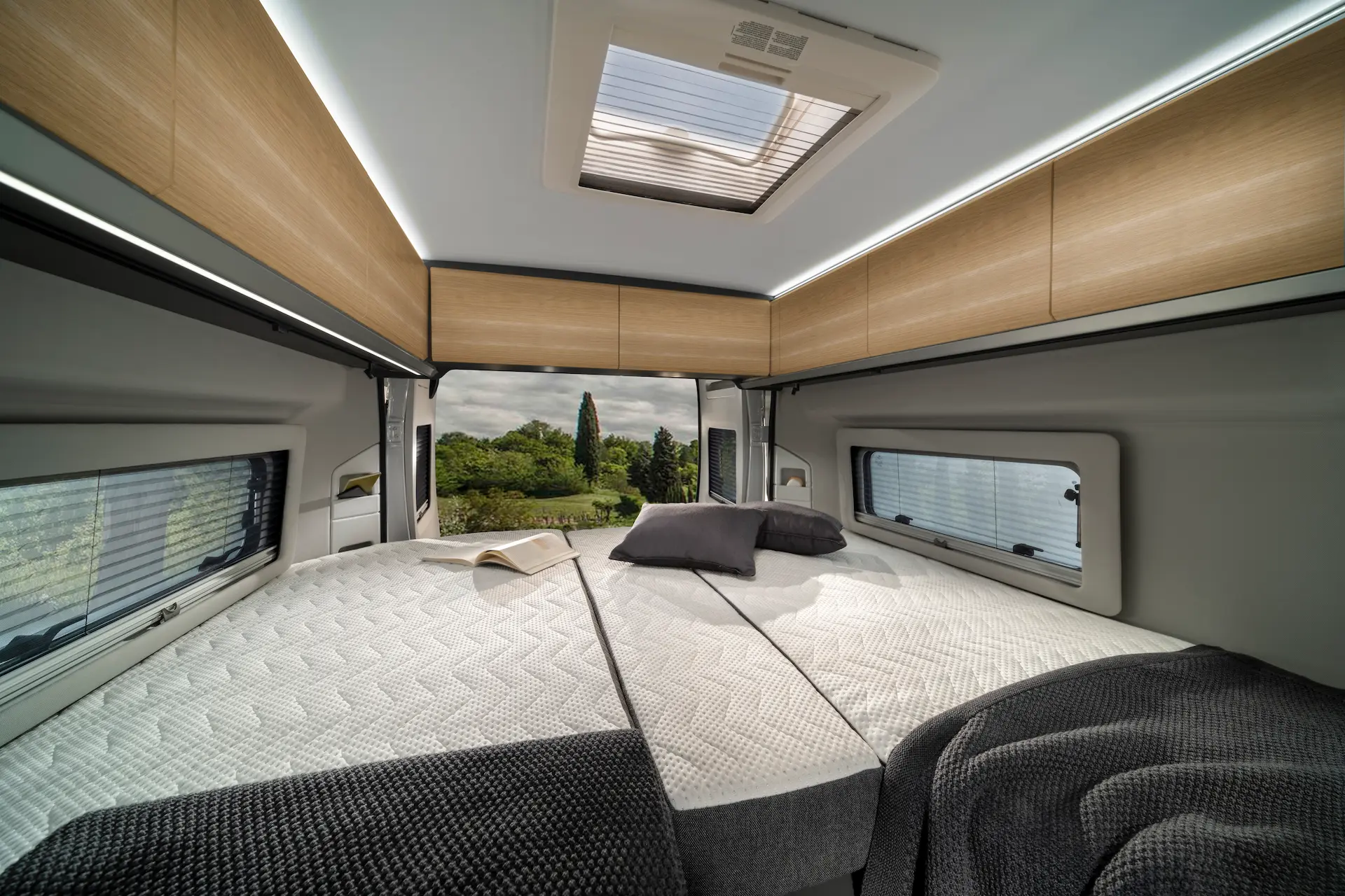 Achterin bevinden zich lengtebedden van 192 x 180 cm – een fijne oplossing voor wie makkelijk wil kunnen in- en uitstappen, zonder over elkaar heen te hoeven klimmen. Met de centrale bedverlenging maakt u er in een handomdraai één groot bed van. Vaste bovenkasten en slimme opbergvakken maken de slaapkamer helemaal af.